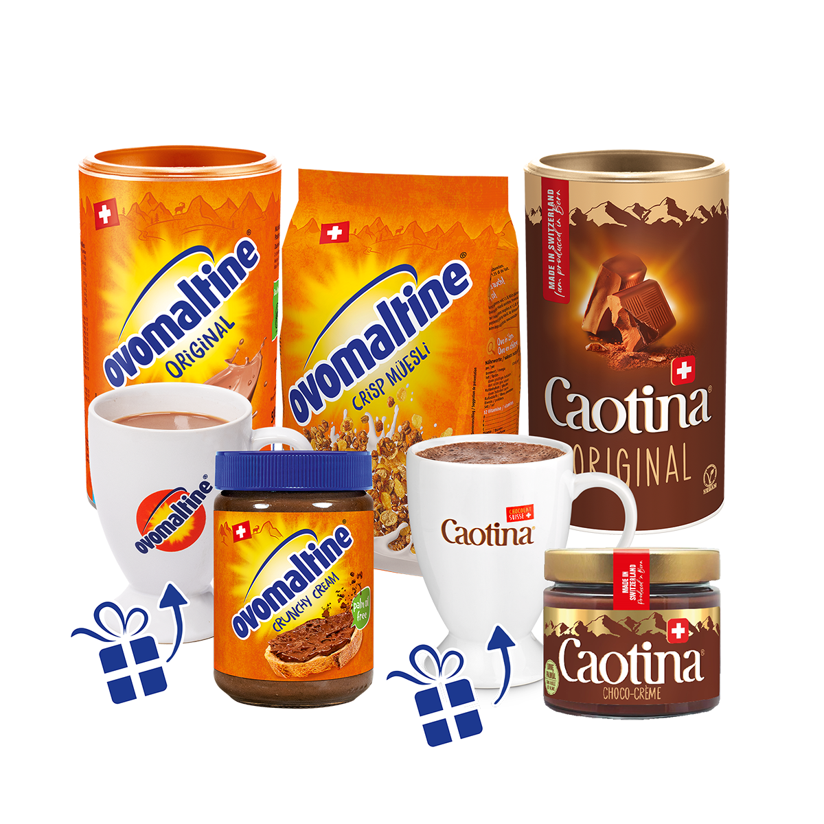 Das Ovo Schwizer Zmorge Set beinhaltet alle Schweizer Frühstücksprodukte von Ovomaltine und Caotina, die Sie sich wünschen – inkl. 2 kultigen Tassen!