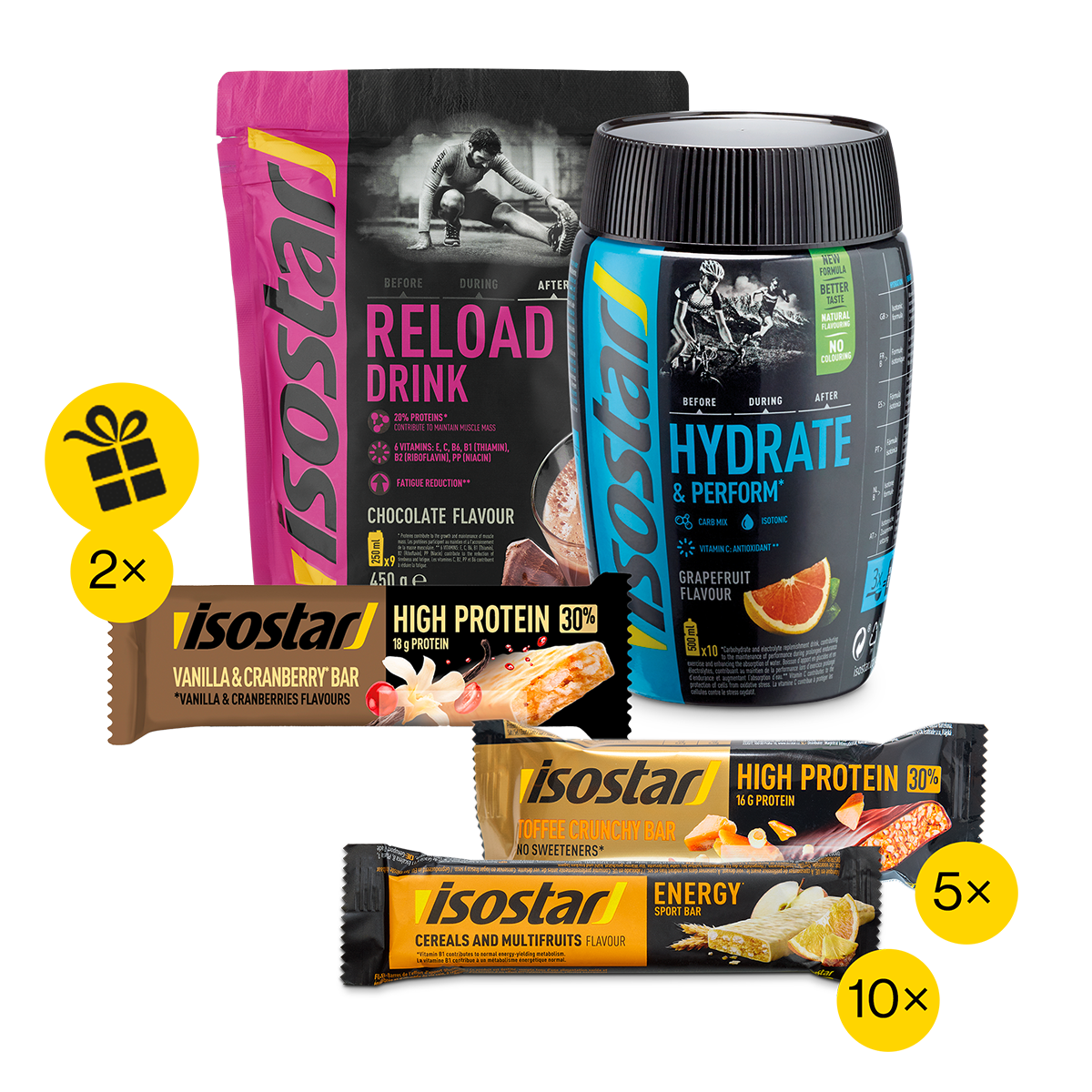 Ce set avantageux contient nos best-sellers et t’apporte l’énergie et les protéines nécessaires pour optimiser les performances d’endurance, le développement musculaire et la récupération. Avant, pendant et après l’entraînement et la compétition. Nous t’offrons deux barres High Protein 30% Vanilla&Cranberry.Tu trouveras les valeurs nutritionnelles, la liste des ingrédients et les allergènes sur chaque produit.