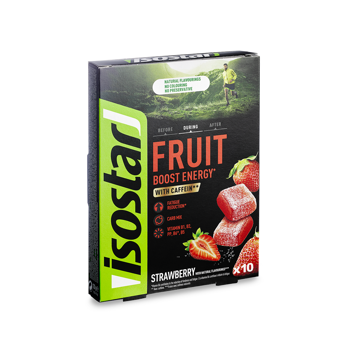 Isostar Energy Fruit Boost – Ces pâtes de fruits goût fraise particulièrement faciles à mâcher, à la teneur élevée en glucides et en caféine, sont des sources d’énergie parfaites avant et pendant l’effort. Elles sont rapidement converties en énergie grâce à une sélection de glucides issus de fruits et du glucose.